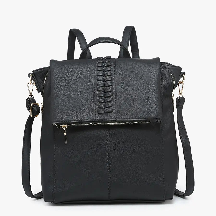 Vivian Distressed Convertible Backpack -Type: Backpack/Satchel -Material: Vegan leather Details: -Flapover snap closure with zippered pocket -Whipstitch detailing -Two side zippers -Back zip pocket -Inner slip and zip pockets -Adjustable straps -Adjustable/removable strap -Gold-tone hardware Dimensions: -Length: 13 inches -Height: 15 inches -Depth: 4.5 inches