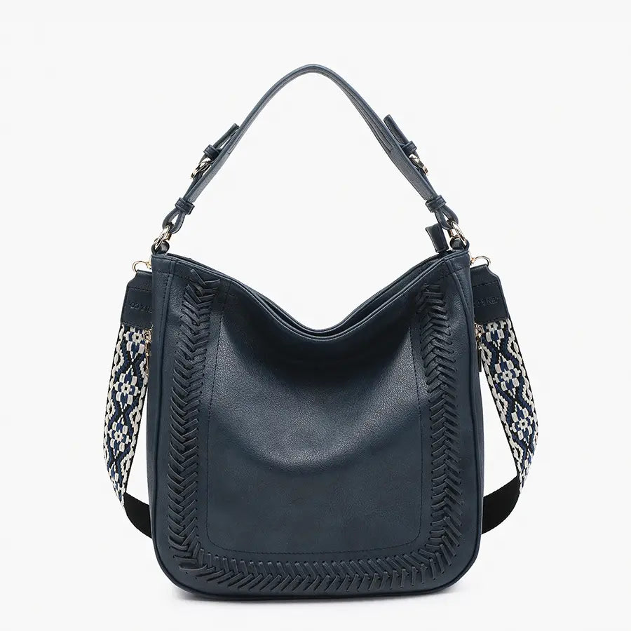 Aris Small Whipstitch Hobo w/ Guitar Strap -Features: Rustic style, removable guitar strap, braided detail front, buckle shoulder strap, side and back zipper pockets, inner slip and zip pockets, brushed gold hardware -Material: Vegan leather Dimensions: --Length: 16 inches -Height: 14.75 inches -Depth: 4 inches