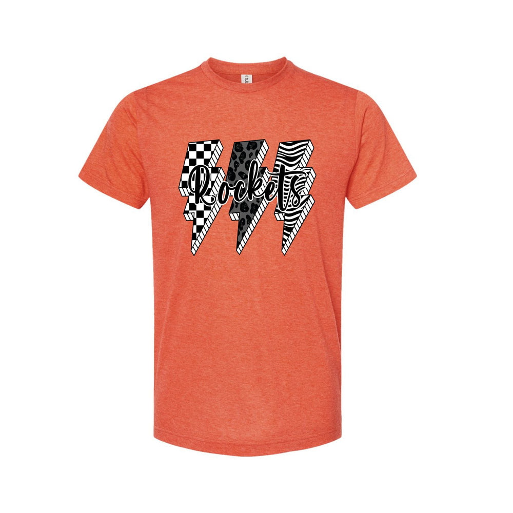 Show off your team spirit with this vibrant shirt featuring the "Rockets" name on three patterned lightning bolts. Perfect for rallying your crew and sparking energy at games or events, this playful design makes cheering on your team even more fun.