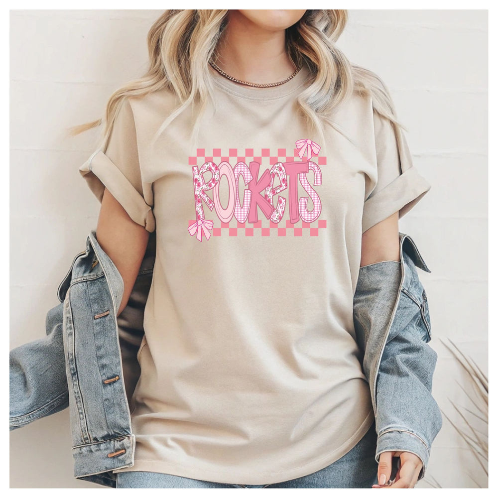 Bring a playful twist to team spirit with this pink checkered Rockets shirt adorned with adorable bows. Its charming design adds a fun and cute vibe, making it a perfect choice to brighten up any game day or casual outing.