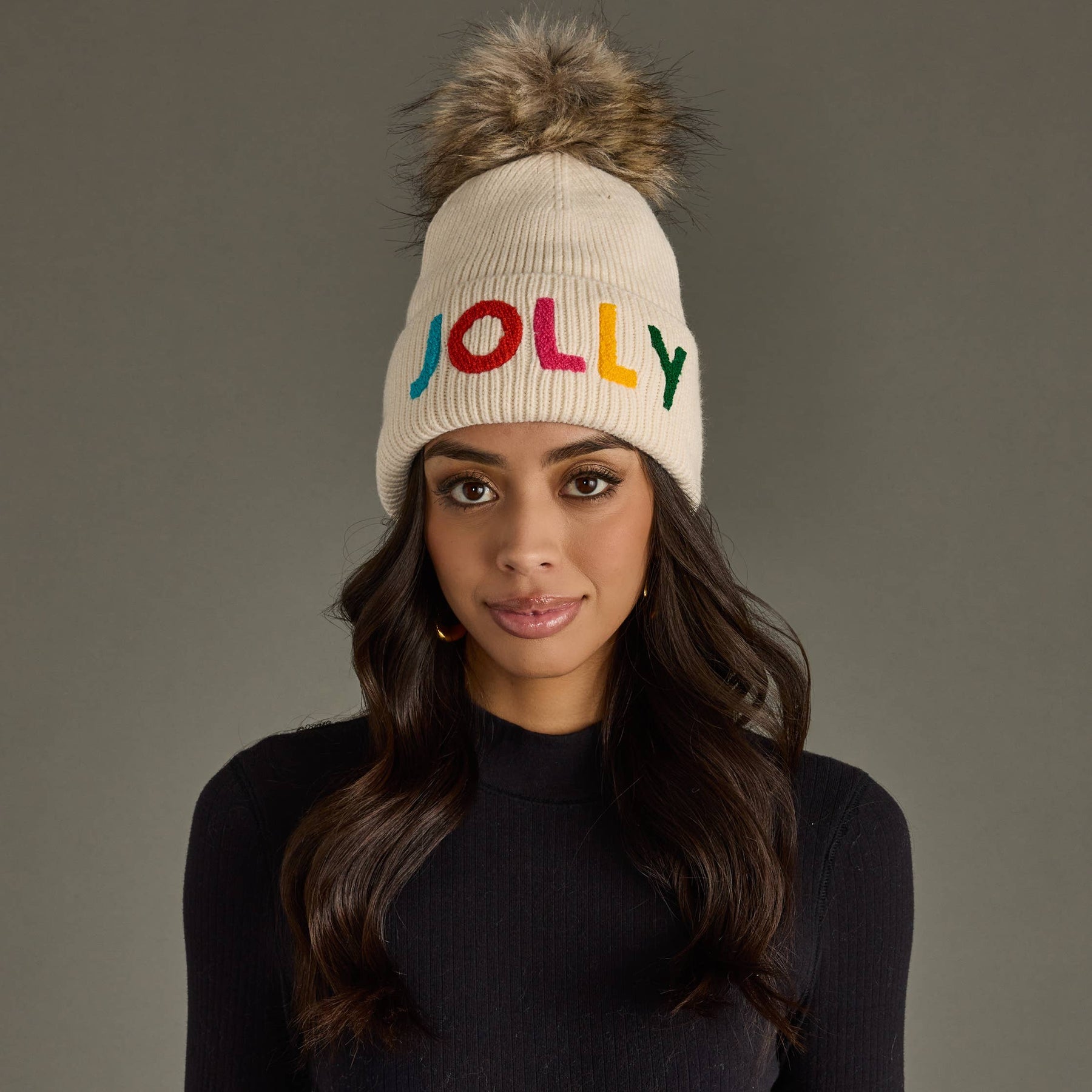 Beige pom hat Pairs w mittens M-446 Multicolored textured "JOLLY" on cuff Natural faux fur pom Fleece lined 100% Acrylic