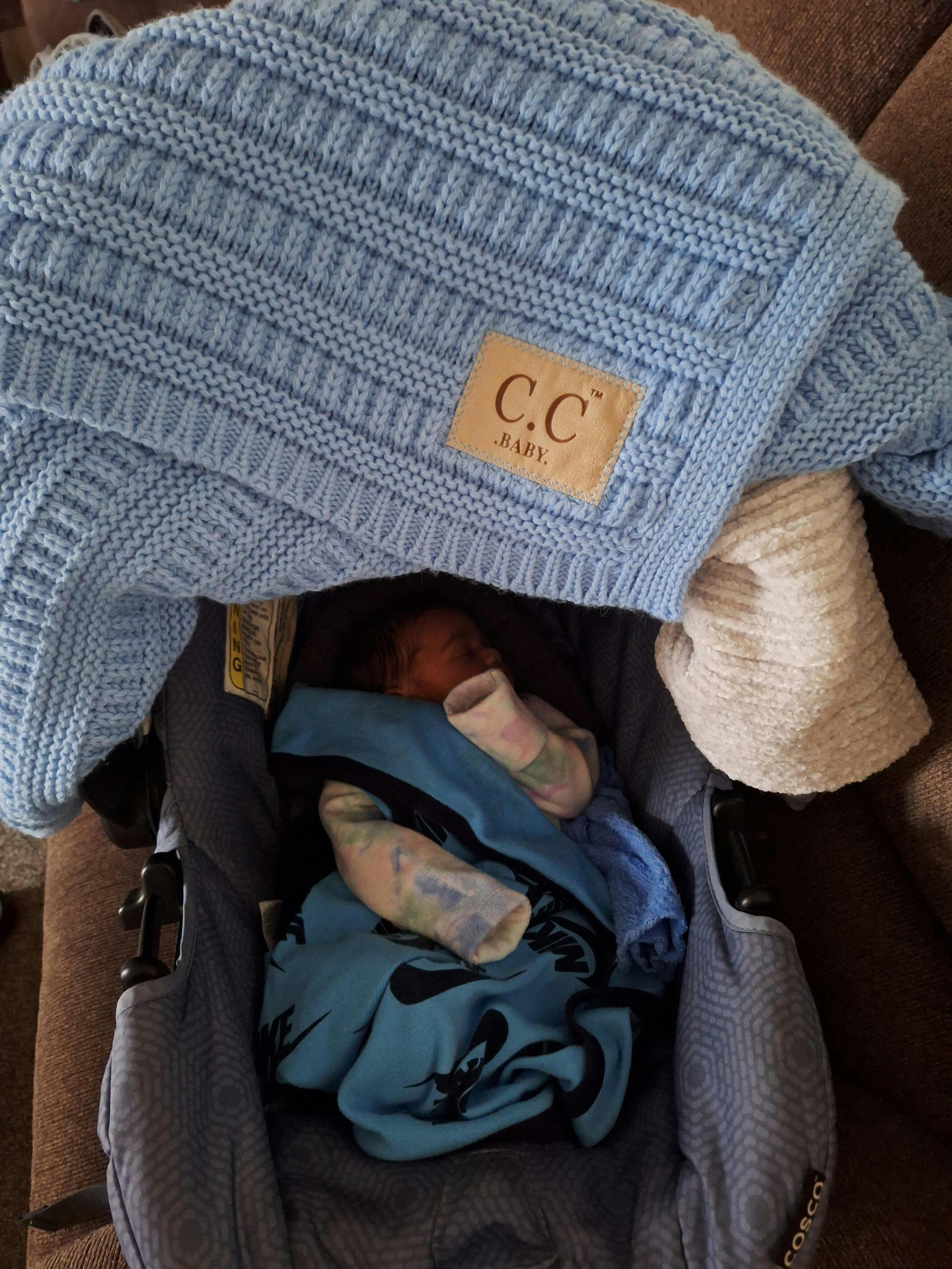 Beautiful baby blanket. On days like today covering baby in his carseat it's a must. I used that heavy ribbed blanket to block the air from getting to him. He will take this blanket when he moves on. Very nice Boutique Blanket.