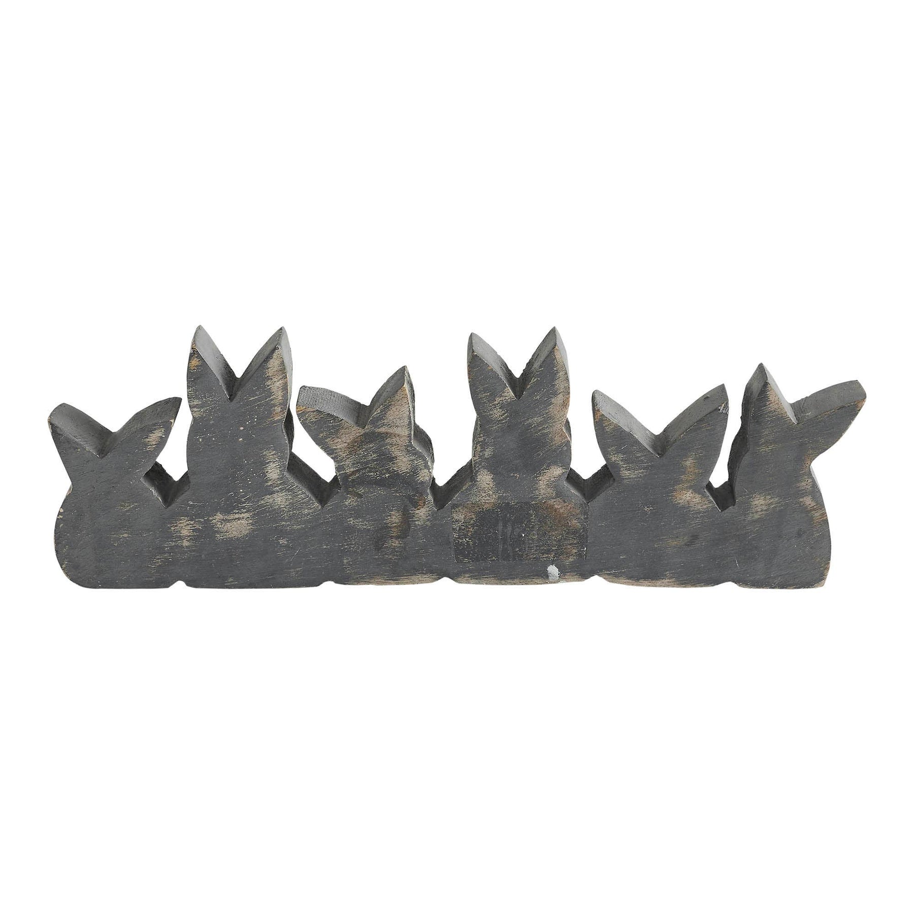 Introducing the VHC Brands Bunny Hop Wooden Easter Sign with 6 Bunny Silhouettes, a charming and festive addition to your spring and Easter decor. This delightful piece measures 4x11.5 inches and is crafted from tropical wood, featuring six bunny silhouettes that spell out the word "Easter" in various spring colors. Each bunny represents a different letter, creating a playful and whimsical display. The bunnies are painted in soft shades of charcoal grey, soft white, and pale pink, adding a touch of rustic charm to your home. Perfect for enhancing your farmhouse or primitive decor, the Bunny Hop Wooden Easter Sign brings a joyful and welcoming atmosphere to any room. Whether displayed in the dining room, entryway, living room, or even the kitchen, this sign captures the essence of Easter with its charming design and vibrant color block. The painted and carved graphic details highlight the craftsmanship and attention to detail, making this piece a standout addition to your seasonal decorations. The sign's rusti