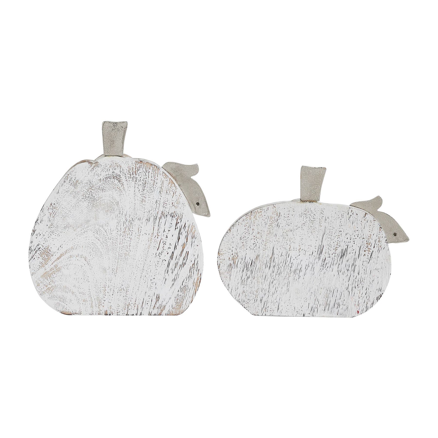 Embrace the gentle whisper of autumn with the VHC Brands White Wash Farmhouse Wooden Pumpkin Set of 2, a captivating duo designed to infuse your space with rustic elegance. Each pumpkin, meticulously crafted from warm whitewashed tropical wood, boasts a subtly distressed finish that evokes the cherished patina of time, creating a beloved vintage charm. Delicately poised aluminum leaves and slender stems shimmer with a soft, silver gleam, offering a sophisticated contrast to the serene blend of whitewash and light brown tones. These beautifully proportioned pumpkins, measuring 9x8.5x1.25 inches and 7x8.5x1.25 inches, are more than mere decorations; they are tactile invitations to a tranquil farmhouse or cozy cottage-core aesthetic, beckoning warmth into any fall or Halloween display. Imagine these charming companions gracing your entryway console, adding a welcoming touch to your kitchen mantel, or bringing a serene glow to a bedside table. Their versatile beauty makes them a seamless fit for any room