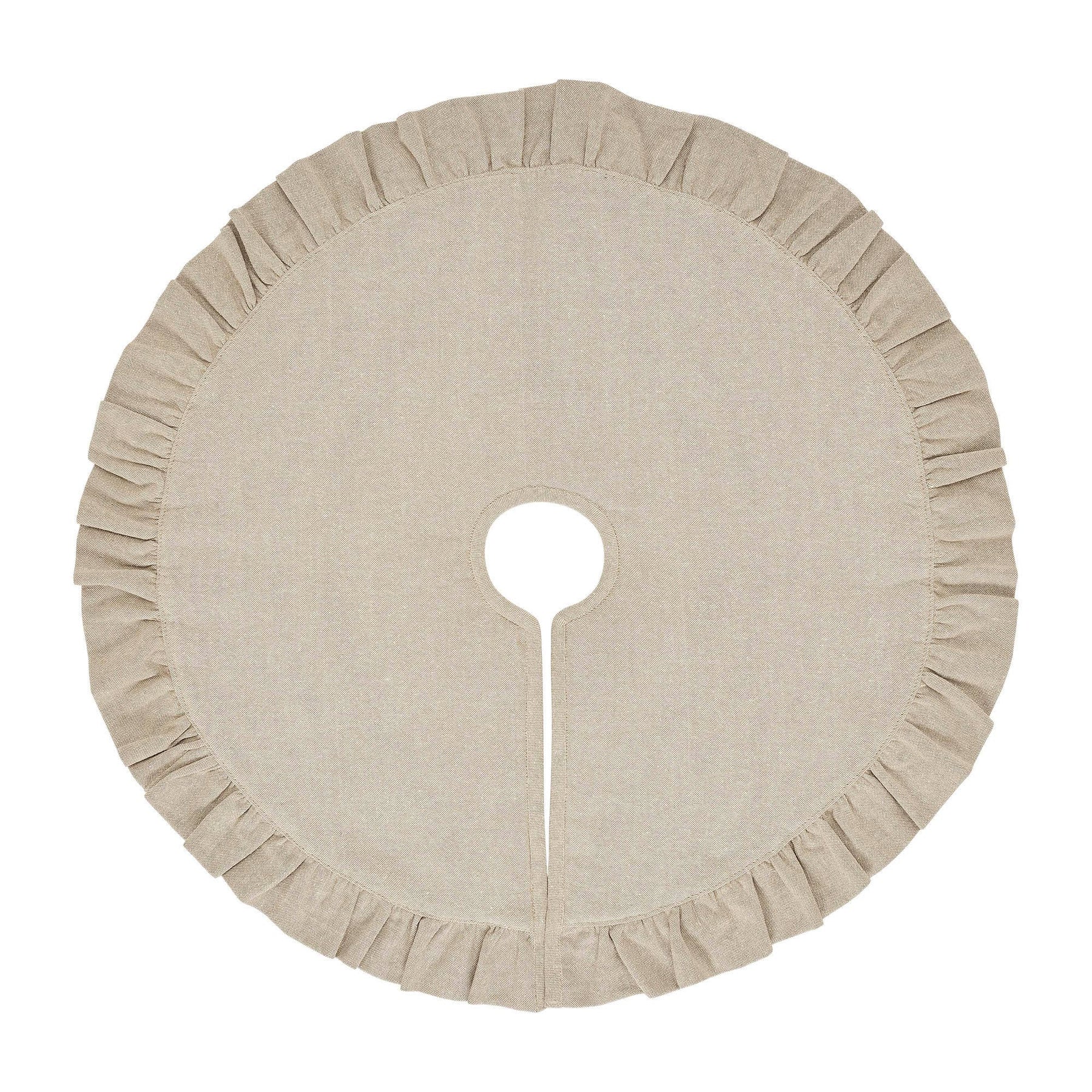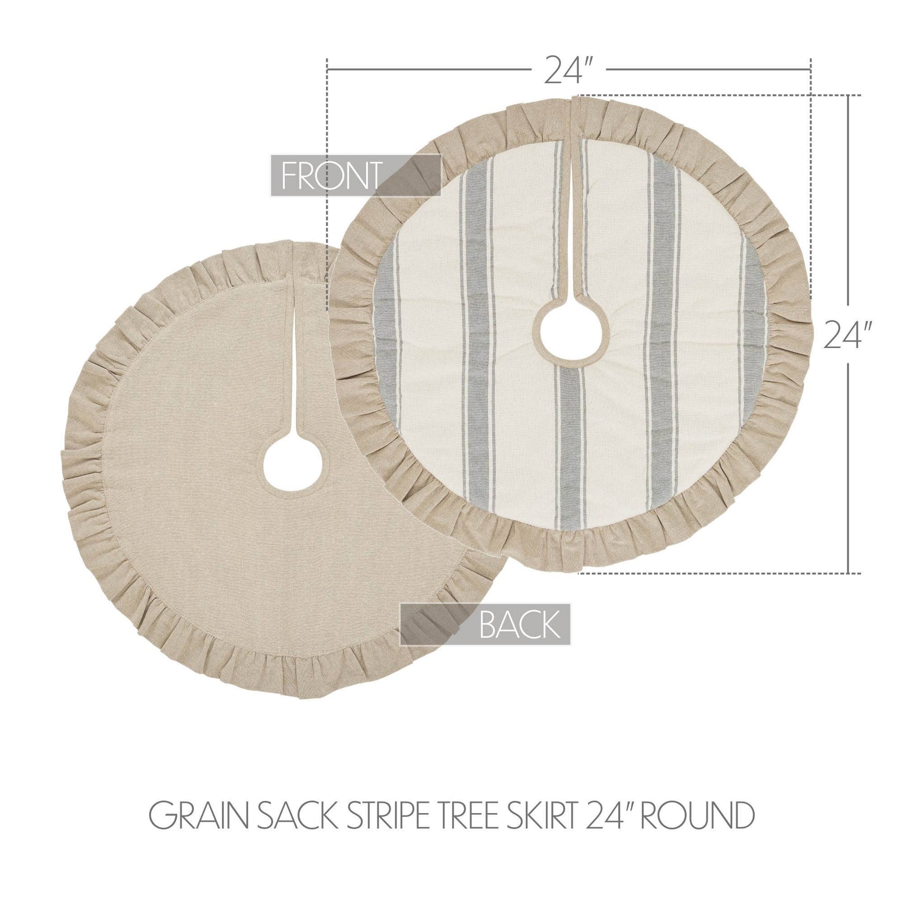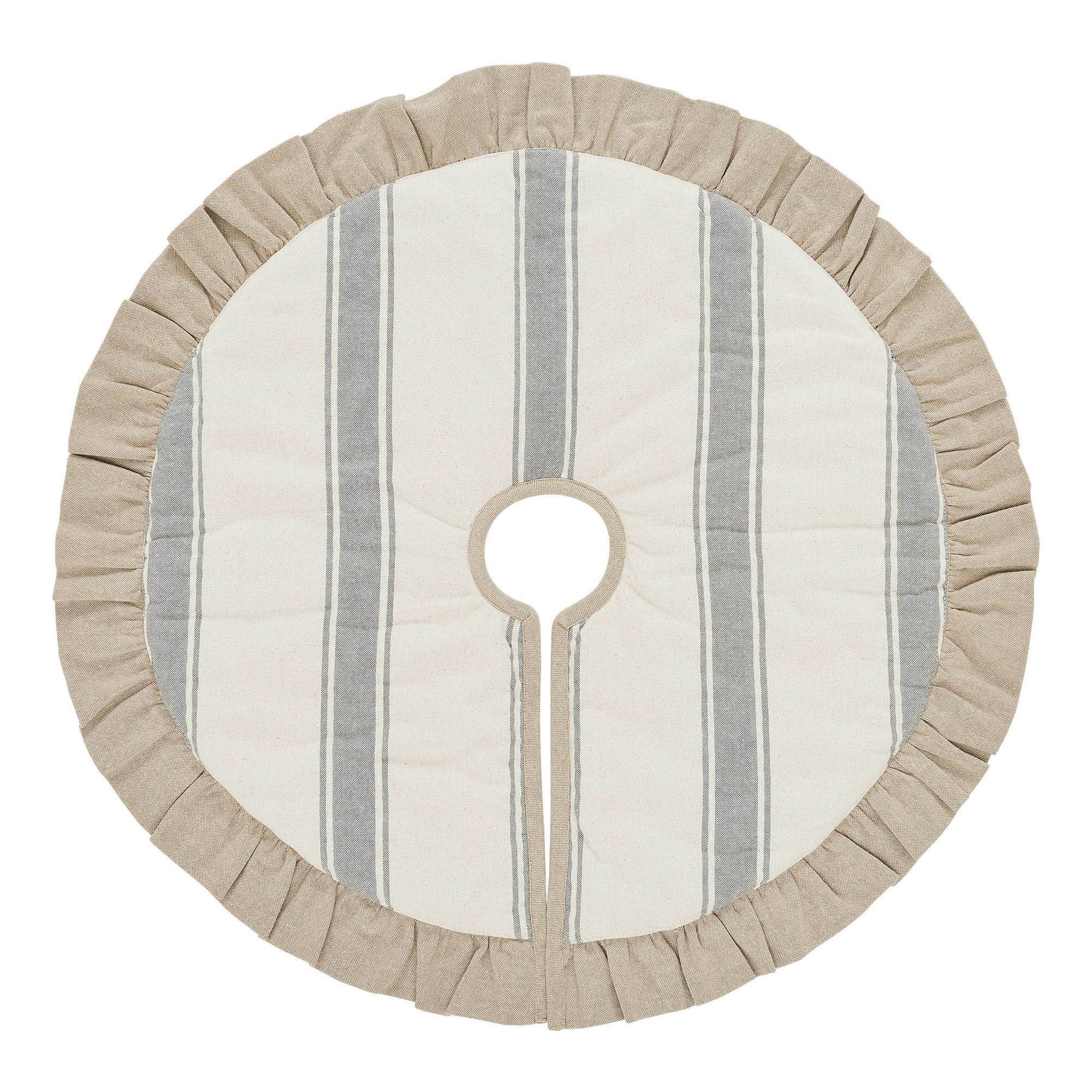 Add timeless style to your Christmas traditions with the Grace Grain Sack Stripe Tree Skirt. The round tree skirt features a 24 inch diameter. A warm creme base with nickel gray grain sack stripes will add simple, sophisticated style for a perfect farmhouse Christmas look. The vintage-inspired tree skirt reverses to a warm tan chambray fabric. That same fabric is featured in a deeply ruffled edge for a look that balances simple and elegant. The neutral Christmas tree skirt is made for yearly use with channel quilting for added style and durability.