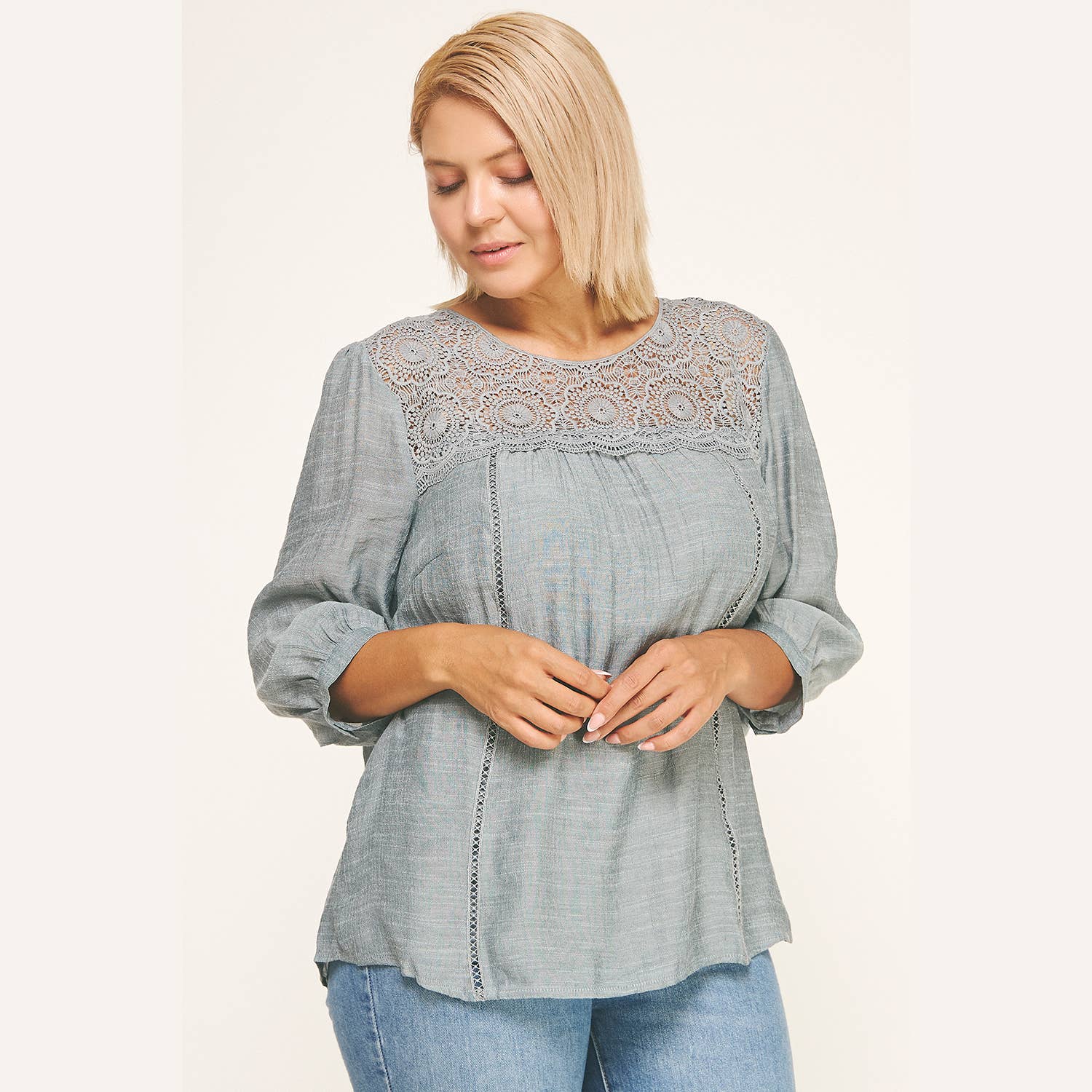A breezy plus size peasant blouse in solid papaya gauze, designed with an applique yoke for a delicate, handcrafted touch. Crafted from 65% rayon and 35% polyester with a full lining for comfort, this lightweight blouse offers an airy drape perfect for casual or layered looks.