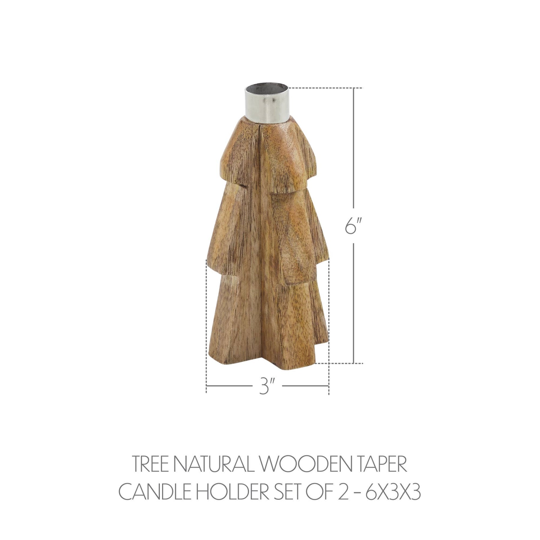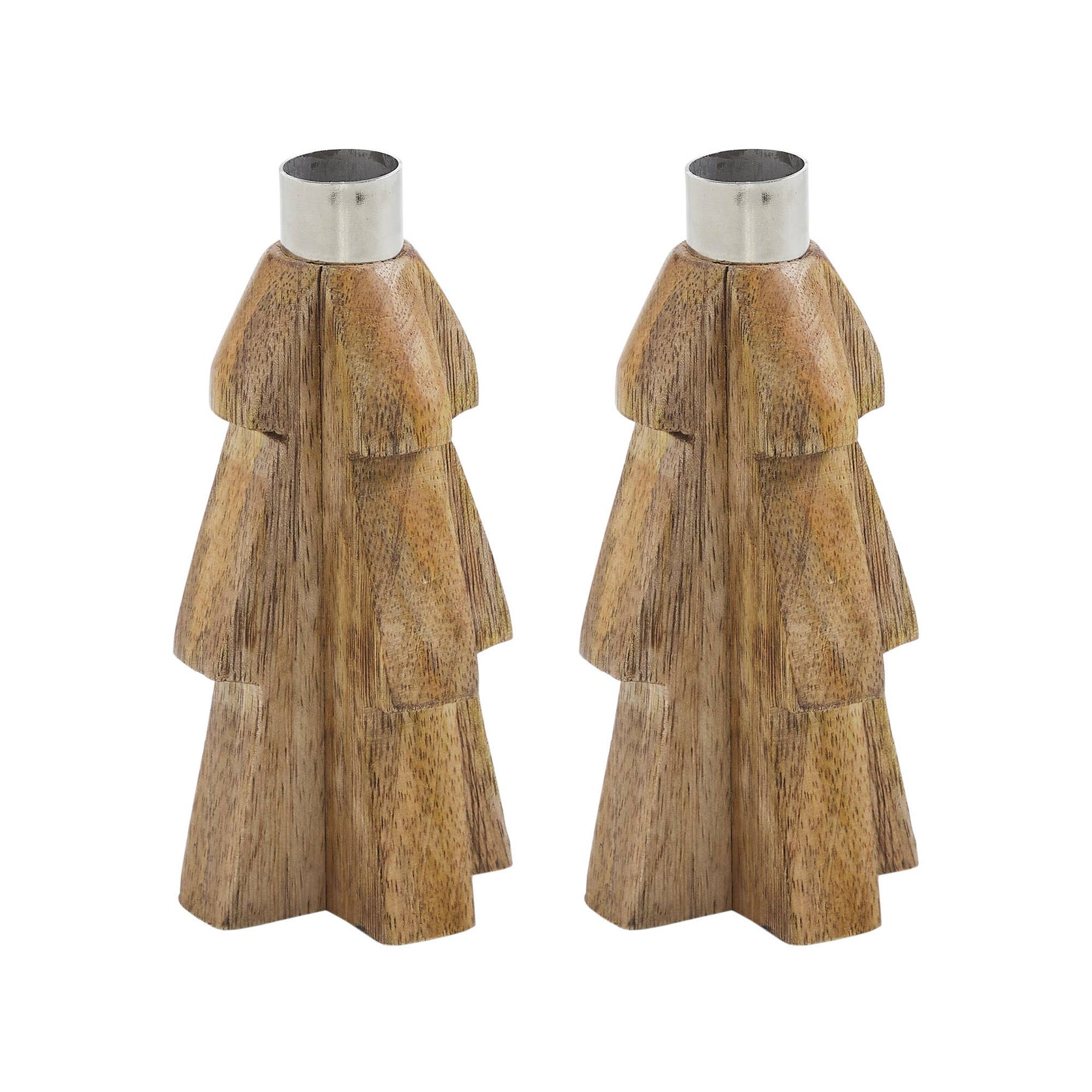 Bring warm, rustic charm to your seasonal decor with the VHC Brands Tree Wooden Taper Candle Holder Set of 2. Crafted from tropical wood, these unique candle holders are shaped like stylized trees in a light natural tan finish. At the top of each tree sits a sleek silver metal insert designed to securely hold a standard taper candle, blending natural textures with metallic contrast. The solid wood construction and clean silhouette give these holders a primitive, handcrafted appeal that's perfect for winter and holiday decorating. The mix of wood and metal offers a balanced, organic look that works well with farmhouse, rustic, or minimalist interiors. Whether displayed on a mantel, dining table, or entryway console, they add understated elegance to any space. Ideal for use in the bathroom, bedroom, dining room, entry, kitchen, or living room, this set of candle holders offers a versatile accent for the season. The neutral tones make them easy to style with other Christmas and winter decorations.