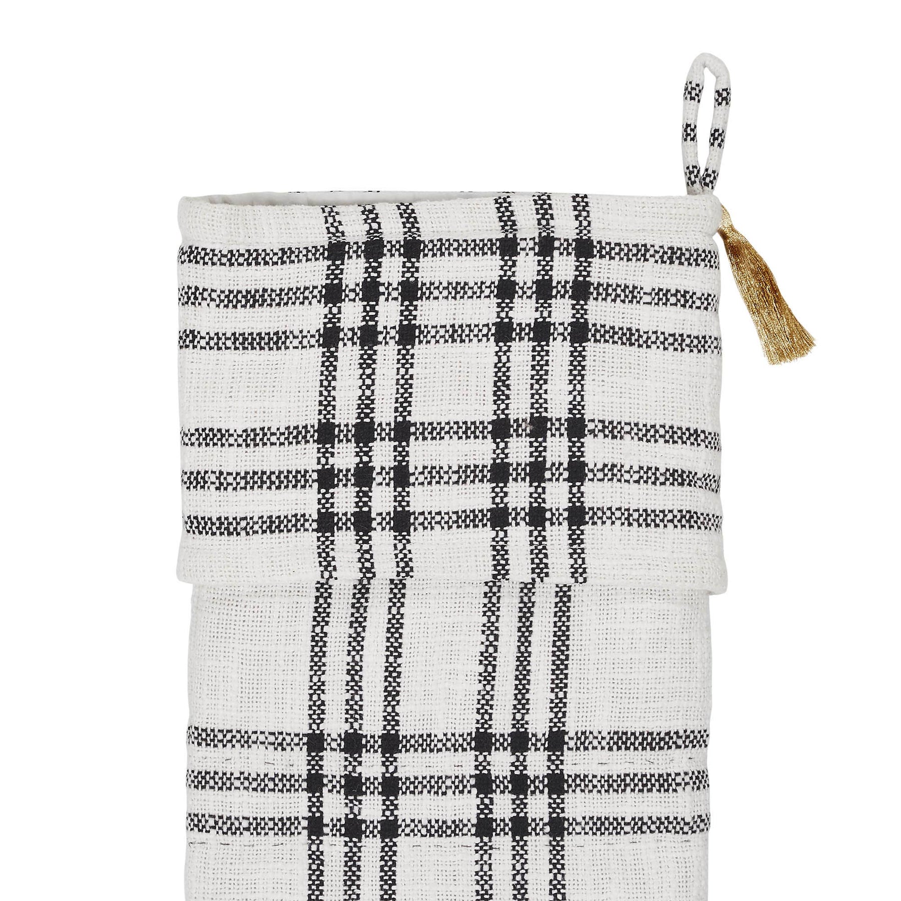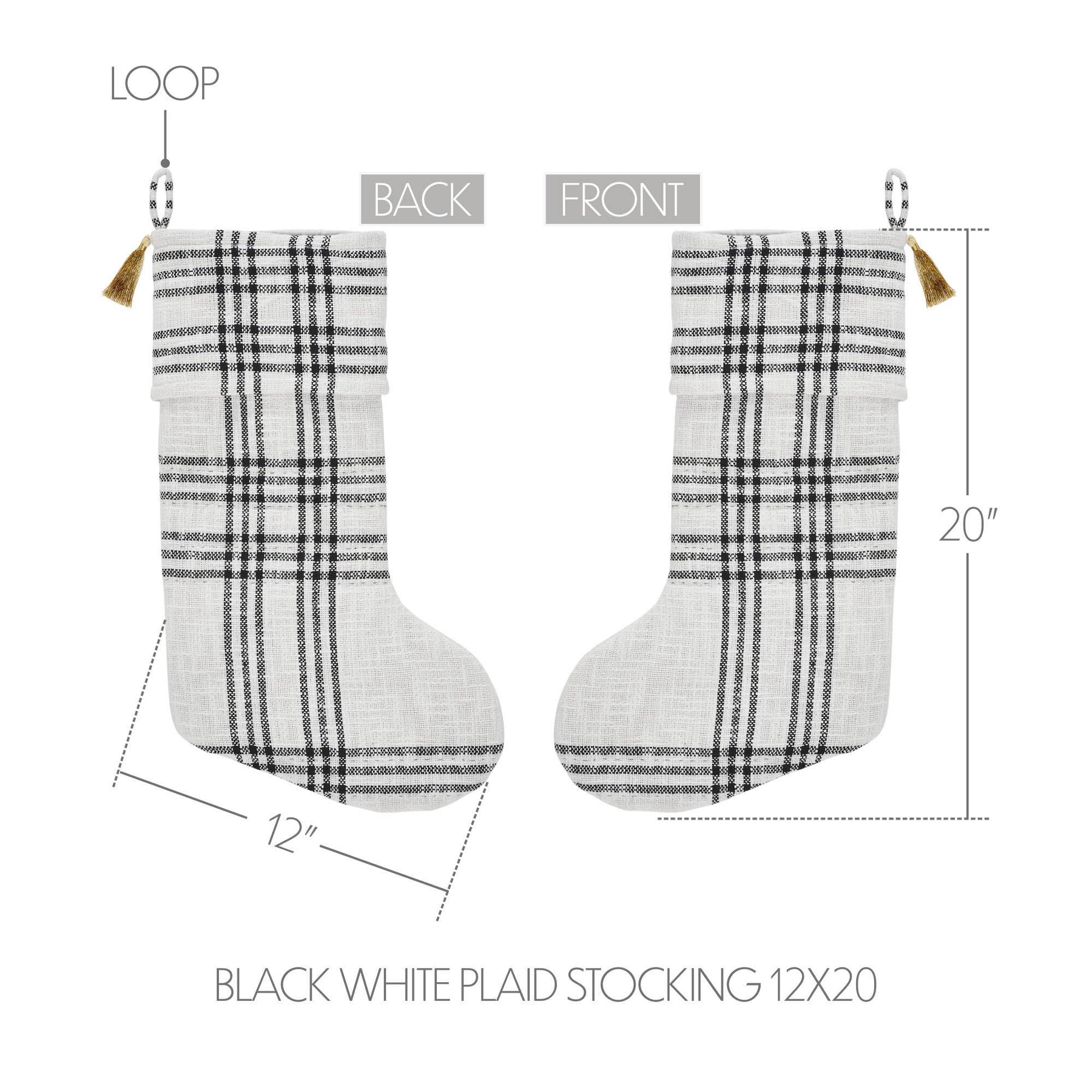 Craft the perfect elegant, minimalist Christmas look with this simple yet elegant stocking. The Wintergleam Black White Plaid Stocking features a white and black plaid base for a simple, traditional look. A coordinating cuff in matching fabric includes a gold tassel accent and a simple hanging loop. Coordinates with the Wintergleam Collection by VHC for modern farmhouse inspired style for your Christmas decor.