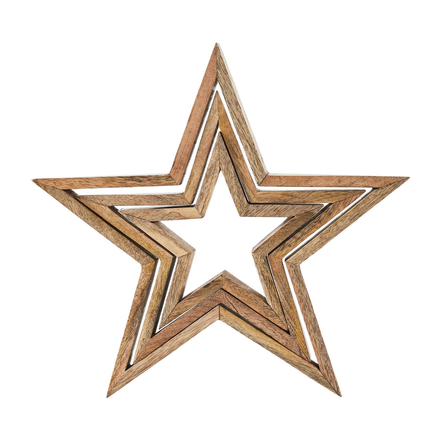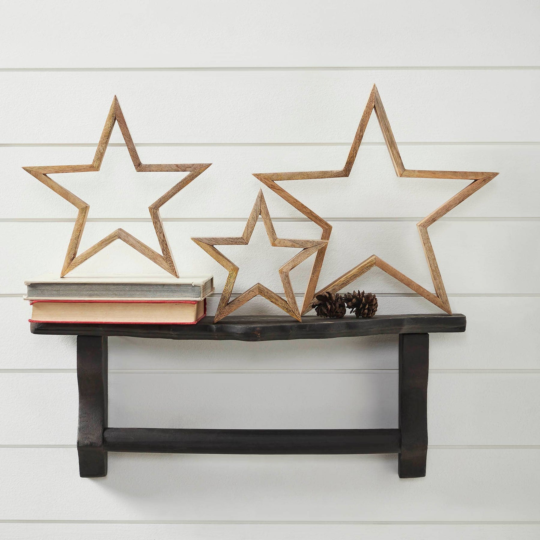 Add a touch of rustic elegance to your home decor with the VHC Brands Tropical Wood Wooden Nested Stars. Crafted from natural wood, these nested stars come in three sizes - 13 inches, 10 inches, and 7 inches - designed to fit together seamlessly, creating a charming layered effect. Perfect for adorning tables and shelves, these stars bring a sense of warmth and coziness to any indoor space. The farmhouse and country-inspired design of these nested stars adds a quaint and inviting vibe to your home. Their natural wood finish enhances their rustic appeal, making them ideal for complementing a variety of decor styles. Whether placed in your dining room, entryway, kitchen, or living room, these stars serve as versatile accents that elevate the visual appeal of any tabletop or shelf they adorn. Maintaining the pristine condition of these nested stars is easy - simply wipe them clean with a soft cloth to remove dust and maintain their natural beauty.